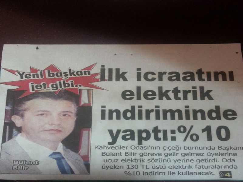 Kahveciler Odasının çiçeği burnunda Başkanı Bülent Bilir göreve gelir gelmez üyelerine ucuz elektrik sözünü yerine getirdi.Oda üyeri 130TL üstü elektrik faturalarında %10 indirim ile kullanacak.